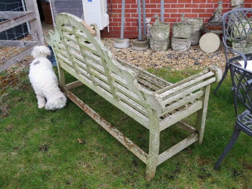 A garden bench having shaped back and scroll arms, approx 168cm wide.