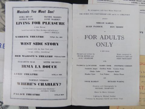 A quantity of assorted Theatre, Opera and Ballet programmes inc Forty Years On starring Alan Bennett, Sailor Beware! at The Strand Theatre, London 1955, starring Ann Wilton, Charley's Aunt starring Simon Lack, For Adults Only at The Strand Theatre 1958 starring Miriam Karlin, Hugh Paddick and Ron Moody, The Banbury Nose starring Roger Livesey and Ursula Jeans, dated 1944 a special performance for His Majesties and Allied Forces Only, Mister Roberts starring Tyrone Power, On Monday Next starring Henry Kendall, etc. Approx thirty items.