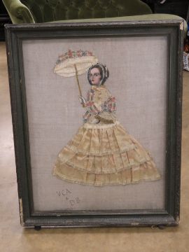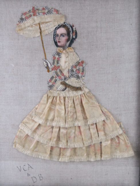 A large framed depiction of a Georgian fine lady. The dress being made from folded silk complete with decopage type parasol printed lower left 'V C A & B B 1930'. Within freestanding easel frame 79 x 61cm.