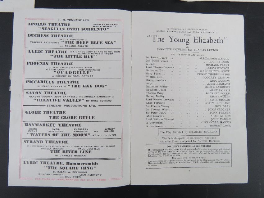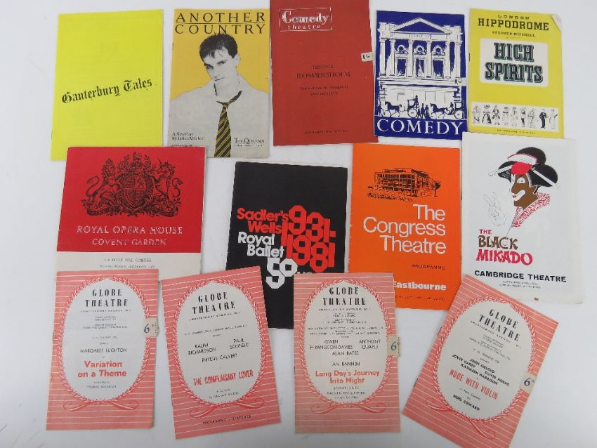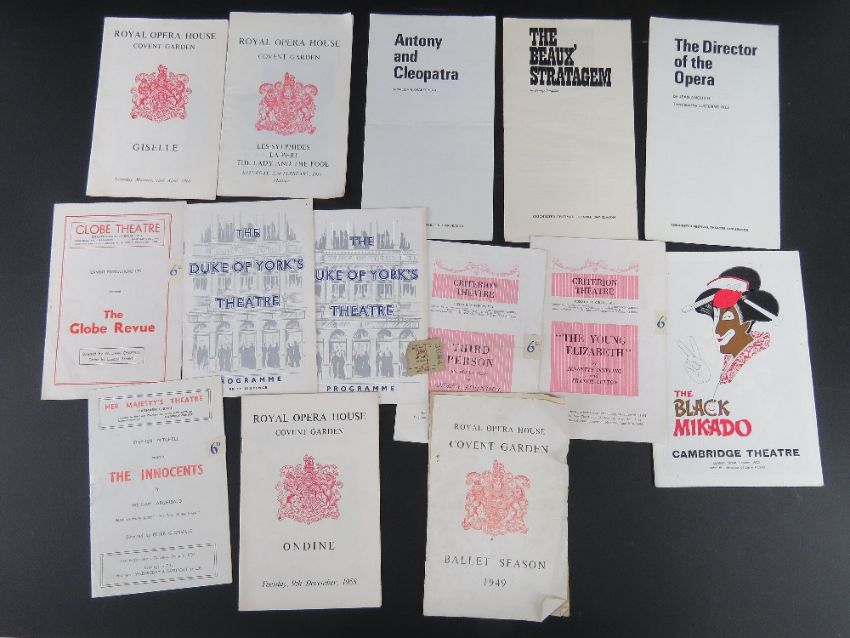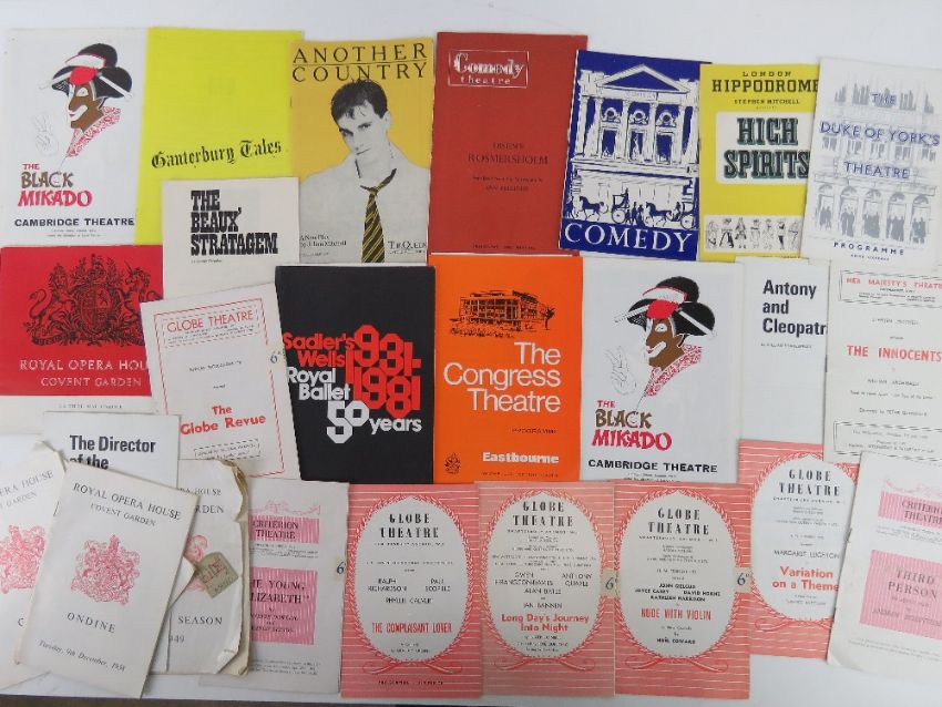 A quantity of assorted Theatre, Ballet and Opera programmes inc High Spirits starring Cyril Ritchard, Rosmersholm starring Dame Peggy Ashcroft CBE, Five Finger Exercise starring Roland Culver, Antony and Cleopatra starring Margaret Leighton, The Black Mikado starring Michael Denison, The Complacent Lover at The Globe Theatre starring Ralph Richardson, Paul Scofield and Phylis Calvert and other Globe Theatre and London theatre programmes inc 'Third Person An Adult Play' by Andrew Rosenthal, etc. Approx thirty items.
