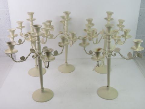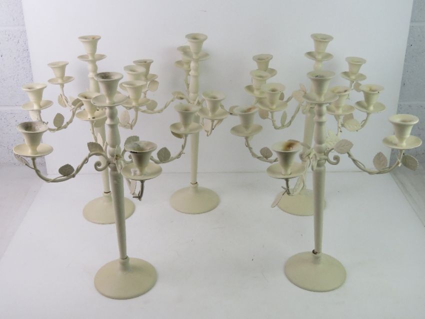 A set of five contemporary cream painted five sconce candleabra - wedding / table decorations.