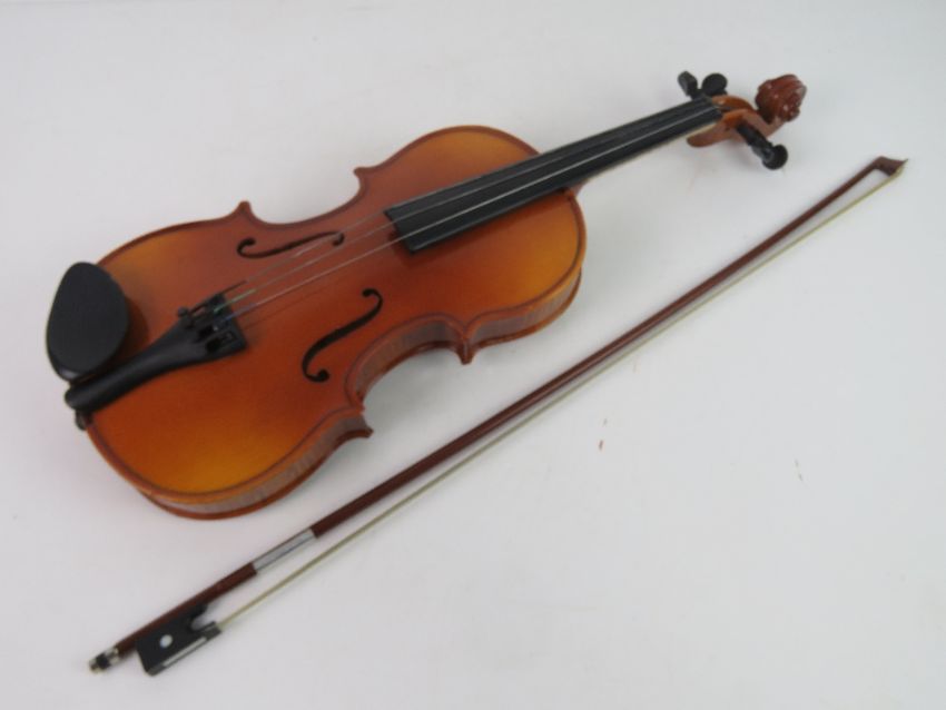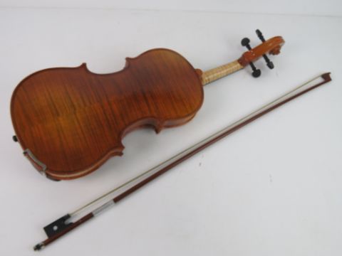A contemporary Violin with bow, in case, approx 53cm in length.