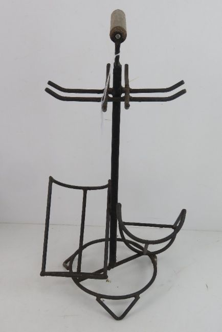A wrought iron wine rack to hold two bottles and four glasses, wooden handle.