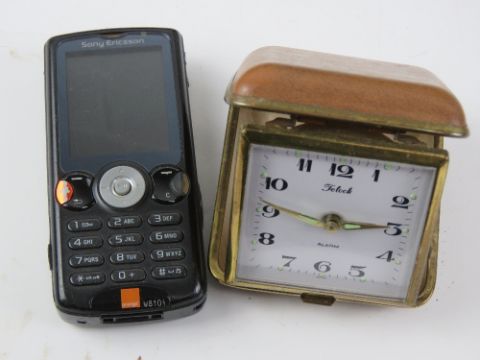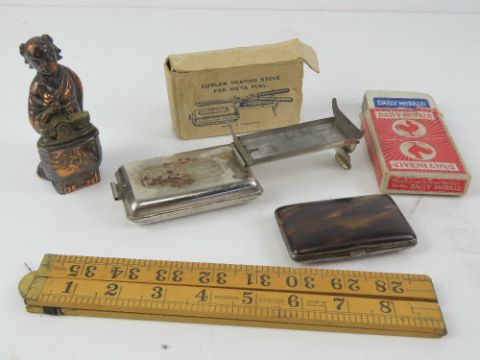 A quantity of assorted collectables including Kodak Brownie 44A camera beirette k camera, Canon Speedlite, Sony Ericsson phone, paper ephemera including postcards and photographs, boxwood folding ruler, etc. All within vintage suitcase.
