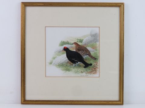 Norman Arlott (1947) Orinthological School, Game Birds Watercolour and gouache highlights Scottish Black Grouse, a cock and hen in the country in breeding plumage Signed in pencil lower right, bears label for 'The Wildlife Art Gallery Ltd,...Suffolk' verso Aperture 7 x 7 1/2 inches ( 17.7 x 19.1 cm)