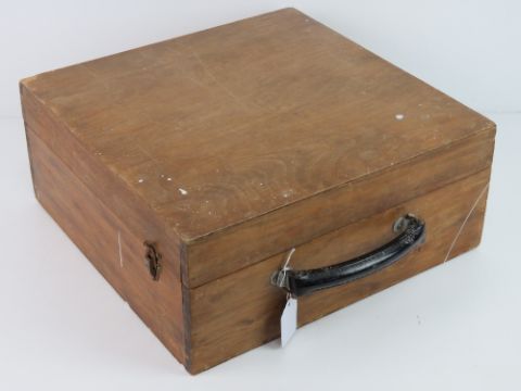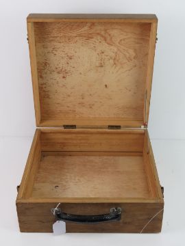 A wooden tool box having side clasps and top handle, 35.5 x 35 x 15cm.