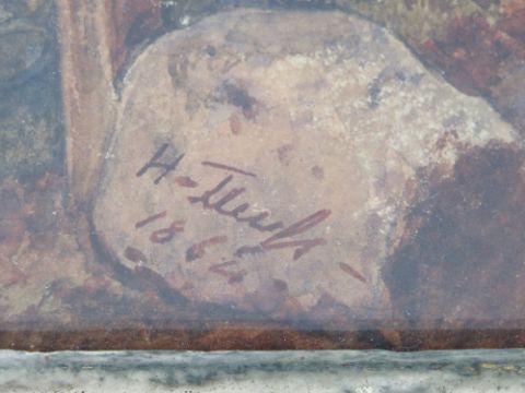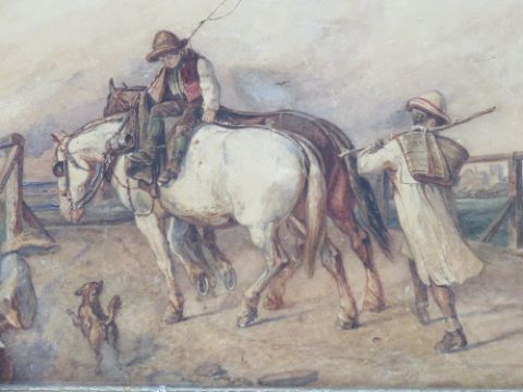 Henry Joseph F Fleuss (1811-1888) Prussian ( German)- English ( naturalised in 1830) Watercolour with gouache highlights ' The Return' a ploughman and boy take a pair of ploughing horses over a bridge Signed and dated ' 1864' lower left 25.5 cm x 35.8 cm ( 10.04 x 14.09 inches) Henry Fleuss was born in Prussia ( Düsseldorf)and settled in England c.1830. A portrait, military and subject painter in oil and watercolour, he was employed as Drawing Master at Marlborough College from 1844 to 1857. Though relatively little is known of his work, Fleuss has a certain fame by association: William Morris attended Marlborough during his time there, and Fleuss's daughter Margaret later married John Bentley, architect of Westminster Roman Catholic Cathedral. He is represented in the collections of the Manchester City Galleries, with a portrait of the Earl of Wilton. He exhibited at the Royal Academy at various times between 1847 and 1874 He is particularly known for his painting of ' His Royal Highness Edward Albert, Prince of Wales Reviewing The Troops, Dublin, 10 th May 1865'( later to become King Edward VII) , George, William Frederick, Marquis of Ailesbury Lt Colonel Commandant of the Royal Wiltshire Yeomanary and ' Hans Busk, Originator of England's Volunteer Army …'