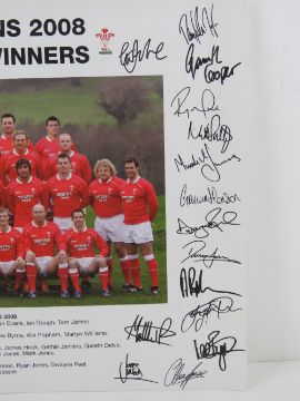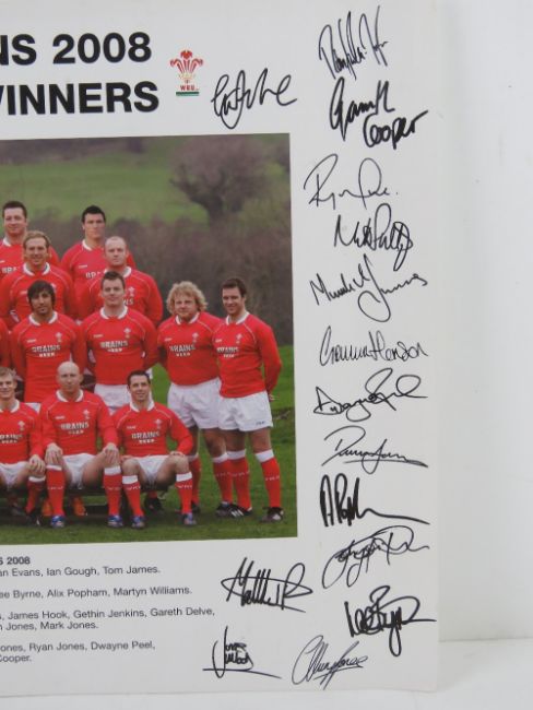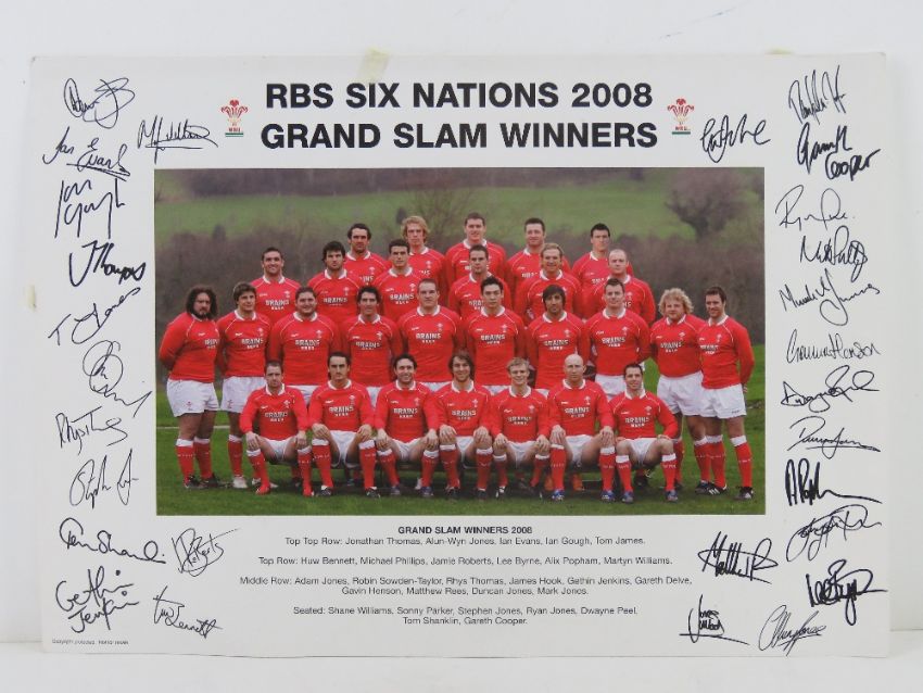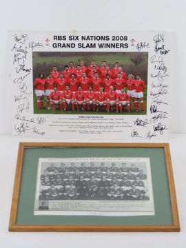 Signed print; 'British Isles Rugby Union Team New Zealand and Australian Tour 1950' hand signed below in black pen by Bleddyn Williams MBE 'B Llewellyn Williams', with another signature in blue pen unknown, framed and mounted, overall 37.5 x 30cm. Together with a Grand Slam Winners 2008 print having facsimile signatures 42 x 29.5cm. Two items.