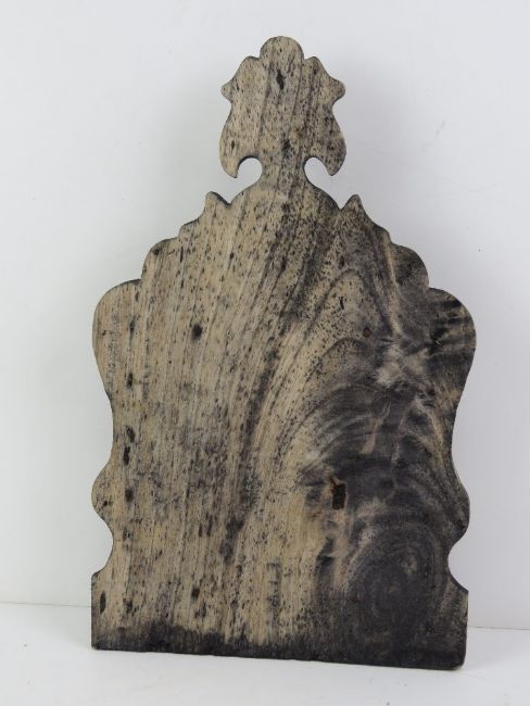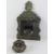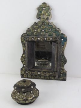 Two carved wooden decorative shrine ornaments decorated with pressed metal 'leaves' and panels. Mirror with twin doors standing 32cm high, lidded pot approx 10cm dia.