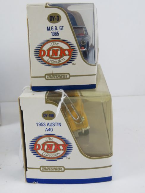 Three Dinky Matchbox vehicles in original boxes, MGB GT 1965, 1953 Austin A40 and 1939 Triumph Dolomite.