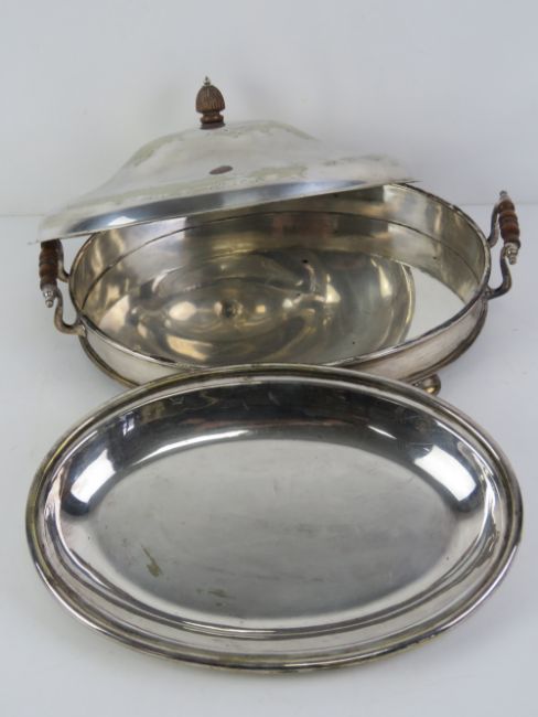 A quantity of silver plated items including chafing dish with turned wooden end handles, kangaroo figurine, clam shell design salt etc.