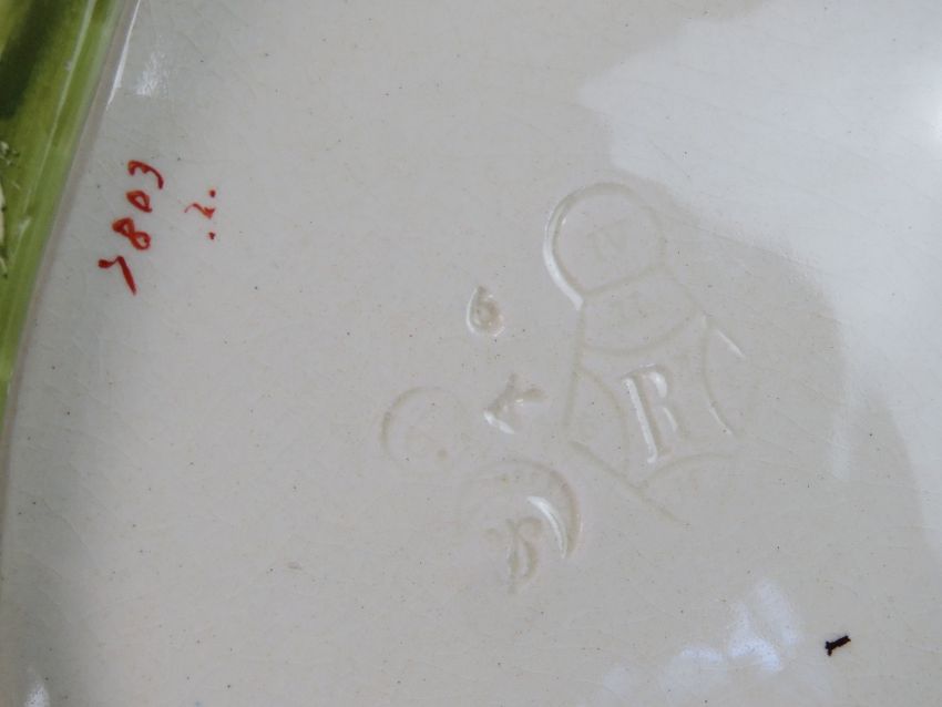 A George Jones & Sons Majolica Strawberry server with jug, bowl and ladle, one piece a/f.