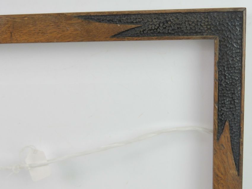 Unusual Art Deco Frame - an Oak varnished frame with stark two corner pokerwork decoration, 1 1/4 inches ( 3.175 cm) wide, to fit 19 3/8 x 13 1/4 inches ( 48.26 x 33.655 cm)