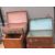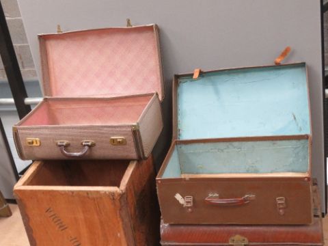 A metal trunk, two vintage suitcases and a vintage tea crate. Four items.