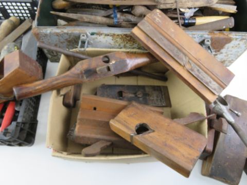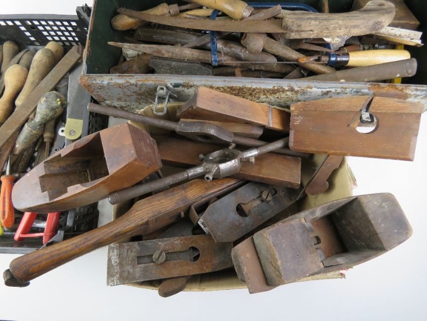 A quantity of vintage wooden hand tools including planes, some bearing makers and owners marks, together with later tools including metal toolbox.