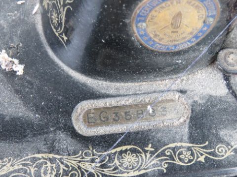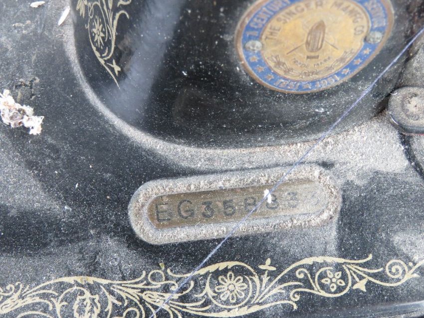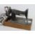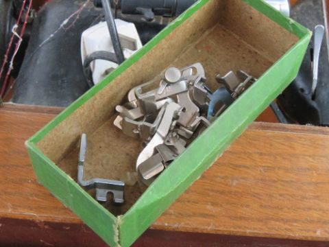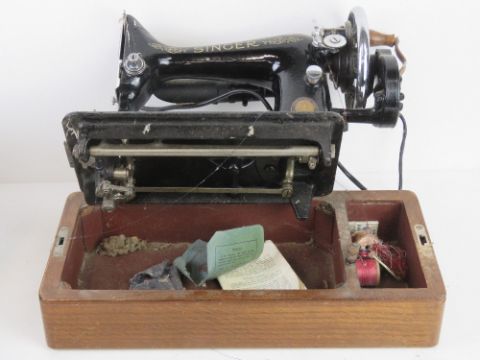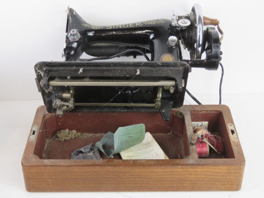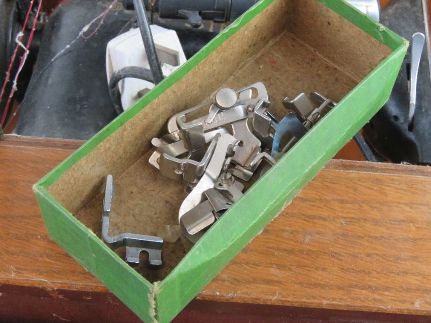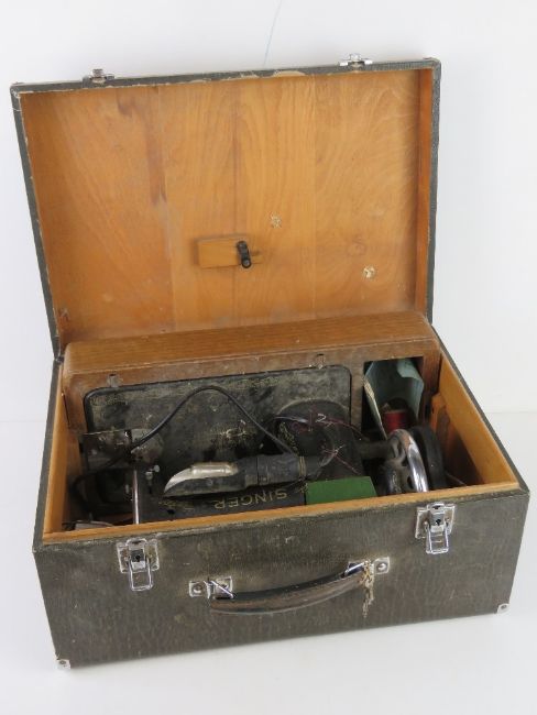 A Singer sewing machine in original case with Singer rubberised mat and cardboard box of accessories including feet.