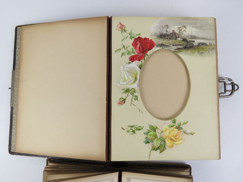 Two antique leather bound photograph albums, the smaller containing a quantity of black and white photographs within.