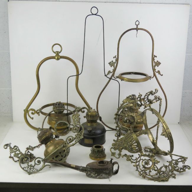 A quantity of lighting fixtures including brass fittings, crystal drops, etc.