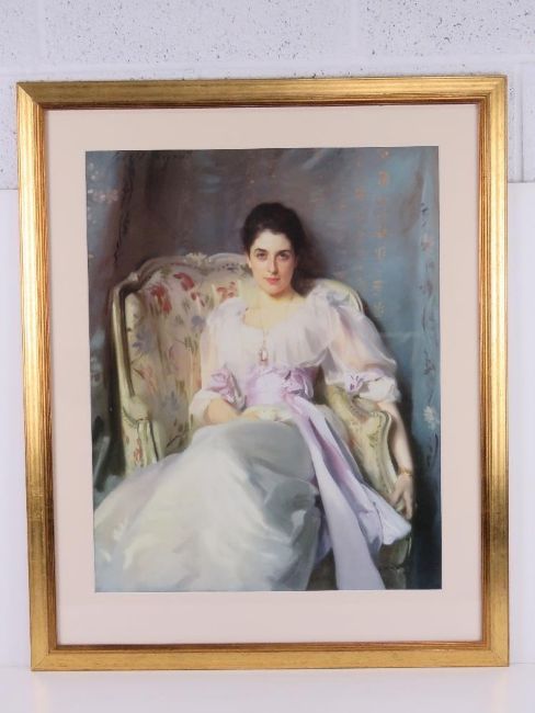 A decorative print of a young lady in white gossamer dress, framed and mounted, overall 70 x 85cm.