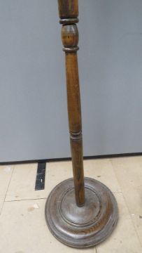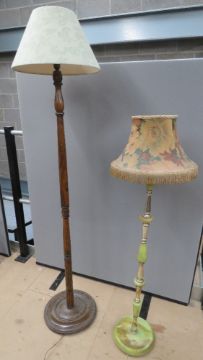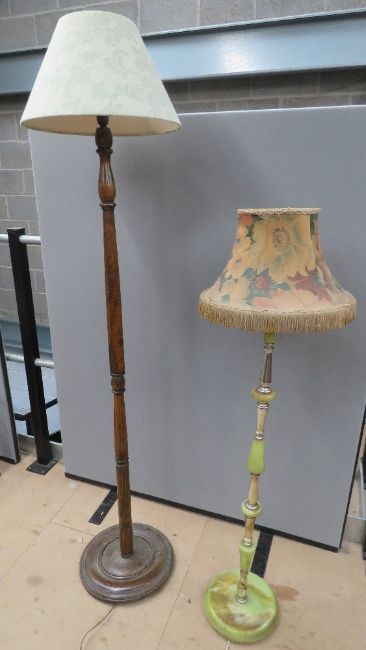 Two lamp standards, one oak the other being a 1970s plasticised 'onyx' lamp, for rewiring.