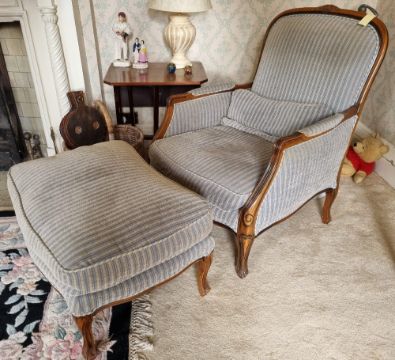 A pair of reproduction wide seat armchairs of Georgian influence with matching footstool. Probably by Brights of Nettlebed.