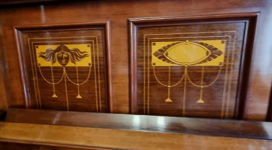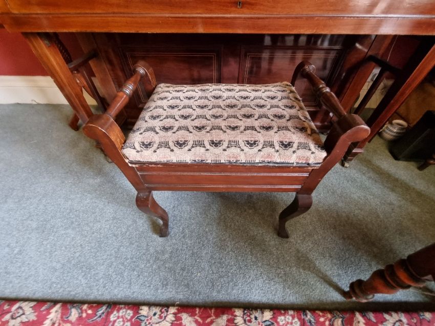 An upright overstrung piano in the Arts & Crafts style by Gors & Karlmann, 148 x 66 x 128cm. With associated stool.
