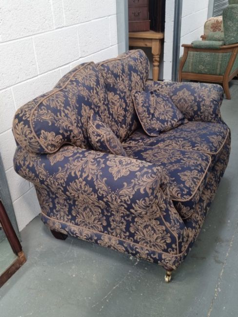 A two seater settee having scroll arms and upholstered in blue and gold fabric, loose cushions, all over brass castors, approx 105 x 53 x 85cm.