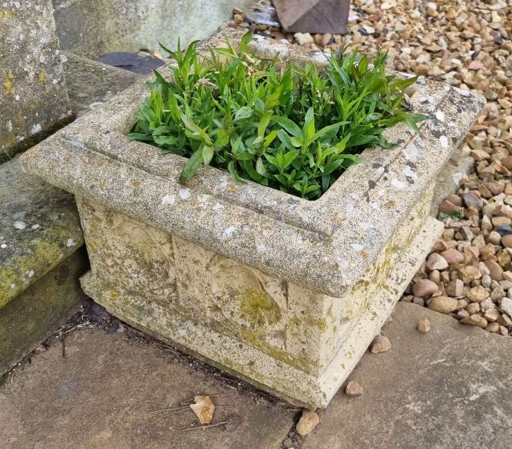 A pair of square shaped stone planters having quatrefoil decoration, 34 x 34 x 24cm.