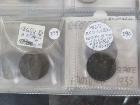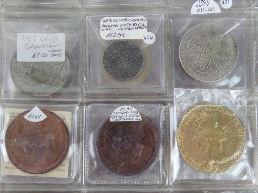 Three folios of assorted British coinage including Victorian, some copies of earlier coins, a Georgian token, etc.