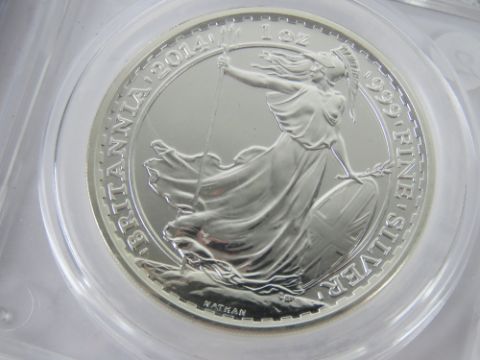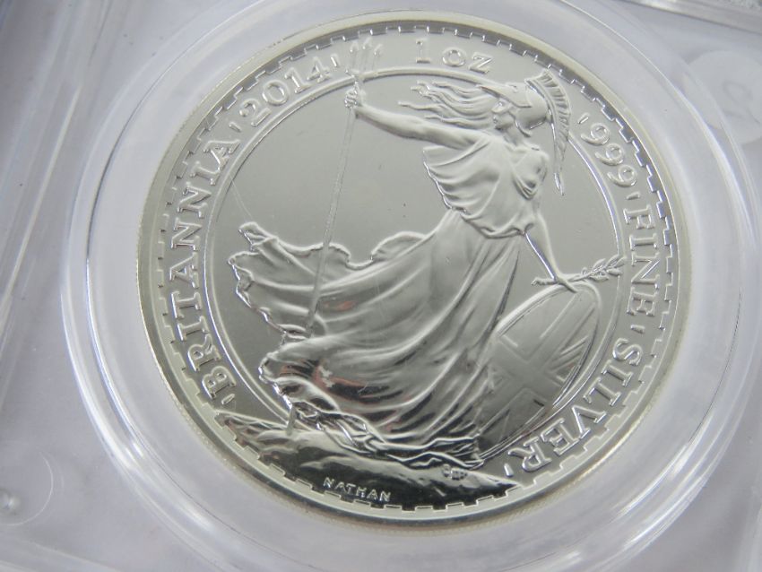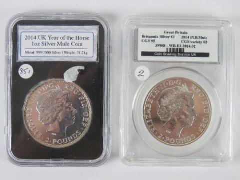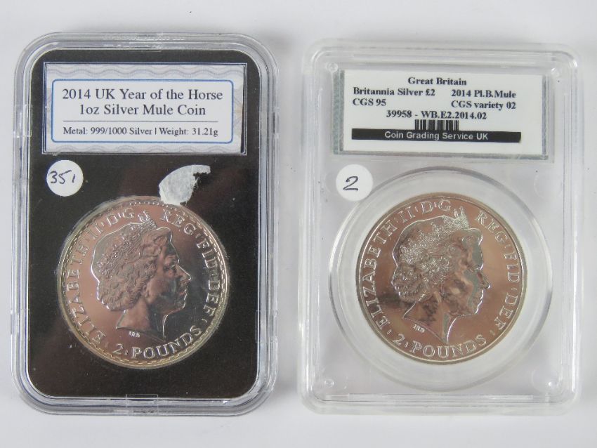 A CGS graded 2014 1oz silver 2014 Britannia 2 Pounds coin, graded CGS 95. Together with a 2014 1oz silver mule coin in protective case. Two items.