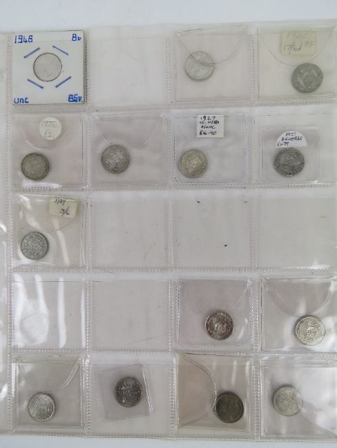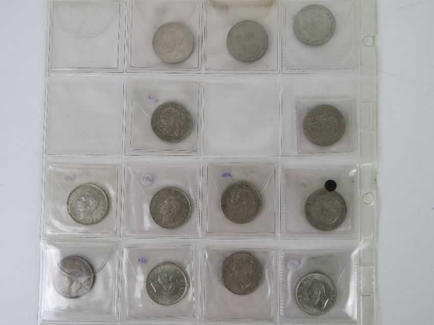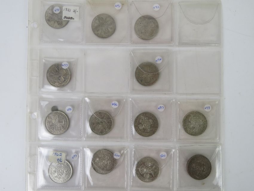 A quantity of half silver 1921-1947 coinage; one florin (x7), two shilling (x6), one shilling (x8), three pence (x13) and six pence (x14).