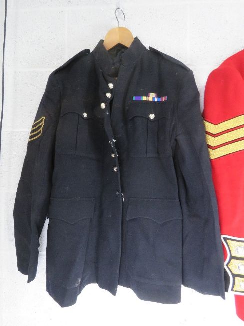 British Army No2 Dress uniform, Scots Guards band tunic, Scots Guards No1 Dress, and other items of uniform including buttons and badges.