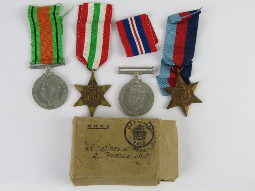 Four WWII medals with ribbons and original medal box; Italy star, 1939-1945 star, defence medal and 1939-1945 medal.