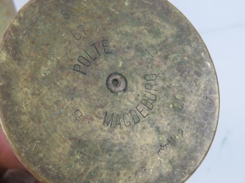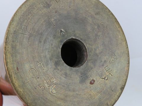 A WWI Trench art shell casing dated 1917, Approx. 23cm tall. Together with a WWII British 12PR inert shell casing, a WWI German 75mm Field gun inert shell, a WWI German Polte Magdeburg shell casing dated 1915 with trench art of a plant saying Avion and from France. Four items.