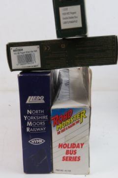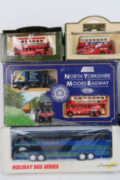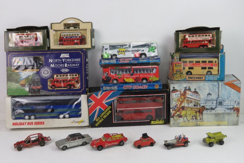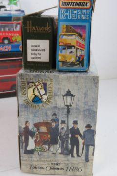 A quantity of scale model buses inc Harrods of London x 2, Matchbox A-15 Berlin Bus, Matchbox horsedrawn bus, etc. Also some loose model vehicles.