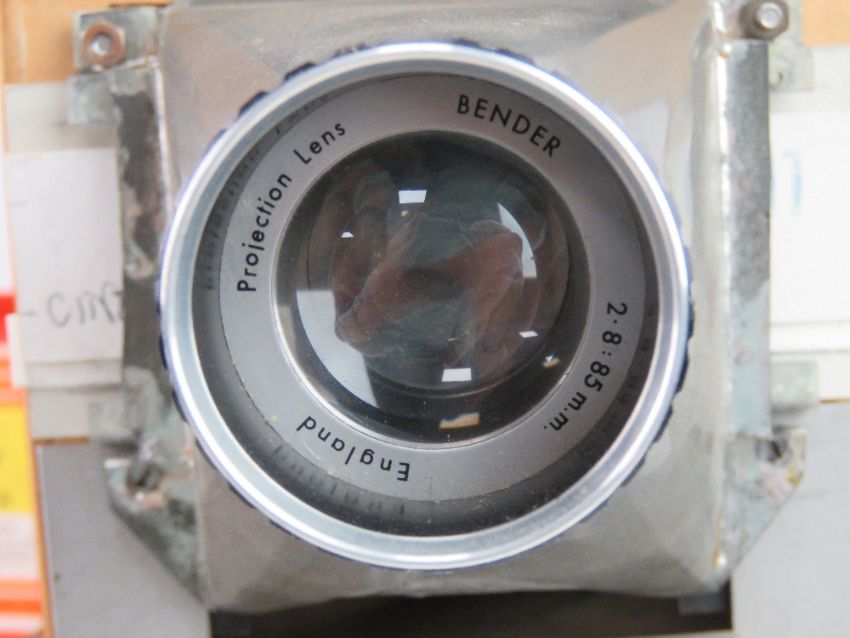 A vintage Bender 2.8:85mm cine projector within fitted stained wooden case. Together with a quantity of associated accessories.