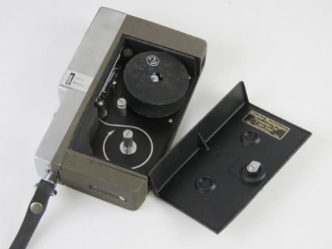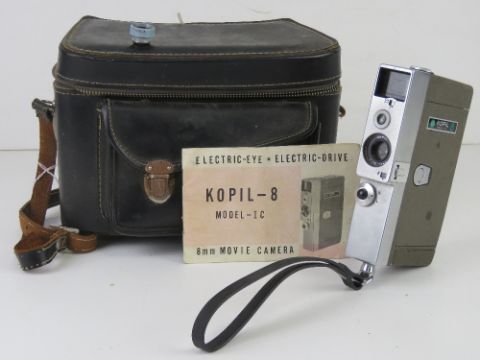 A Kopil-8 Model IC 8mm movie camera with paperwork and case.