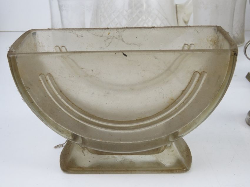 A quantity of assorted glass and metalware including ARt Deco hemispherical bowl, silver plated bud vases and posy vase, etc.