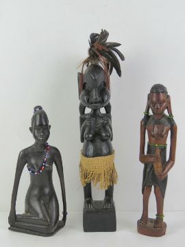 Three carved and decorated fertility statues, shortest 26cm high.