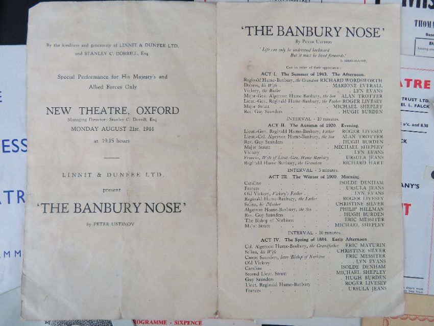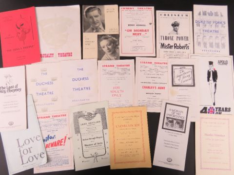 A quantity of assorted Theatre, Opera and Ballet programmes inc Forty Years On starring Alan Bennett, Sailor Beware! at The Strand Theatre, London 1955, starring Ann Wilton, Charley's Aunt starring Simon Lack, For Adults Only at The Strand Theatre 1958 starring Miriam Karlin, Hugh Paddick and Ron Moody, The Banbury Nose starring Roger Livesey and Ursula Jeans, dated 1944 a special performance for His Majesties and Allied Forces Only, Mister Roberts starring Tyrone Power, On Monday Next starring Henry Kendall, etc. Approx thirty items.