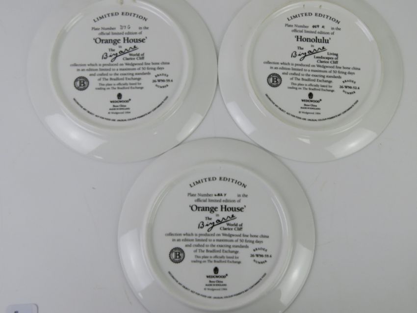 A Clarice Cliff design later produced by Wedgwood; four decorative plates in Bizarre patterns 'Orange Erin', 'Orange House' (x2 one with certificate), and 'Honolulu'.