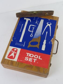 A tool set including spanners, plane, chisels, saw hand drill etc by Krakpol. in original box together with a spirit level having brass fittings.