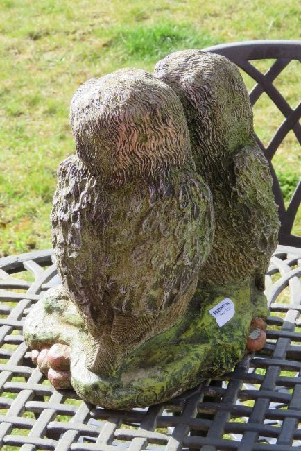 A pre-cast and painted garden statue of three owls standing 32cm high.