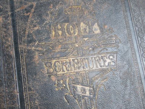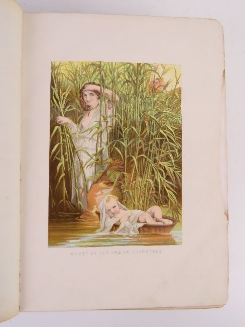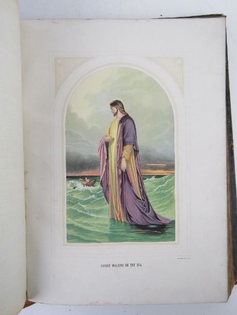 A leather bound bible with marginal reading and parallel references and the commentaries of Henry and Scott condensed with a series of illustrations in chromo-lithography published by William Collins Sons and Co Glasgow, London and Edinburgh.