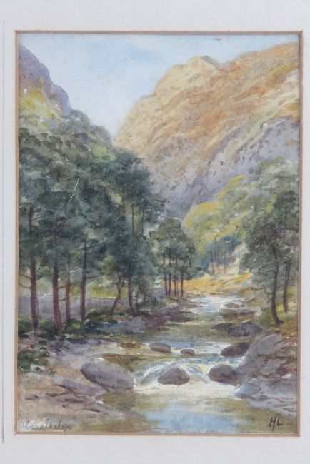 Two watercolours by Harold Laws, one being Aberglaslyn Pass N. Wales c1910, sight size 12 x 17, frame size 25.5 x 32cm, the other being a snowy street scene, sight size 26.5 x 17cm, frames size 40.5 x 31.5cm.