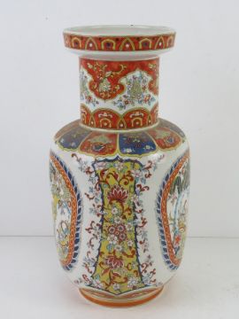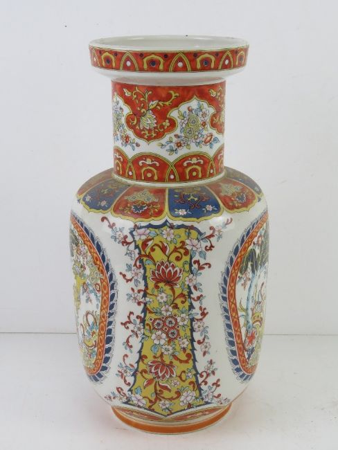 A contemporary Chinese influence vase in white ground with blue and orage decoration and Fo dogs upon. 35cm high Slightly A/F to rim