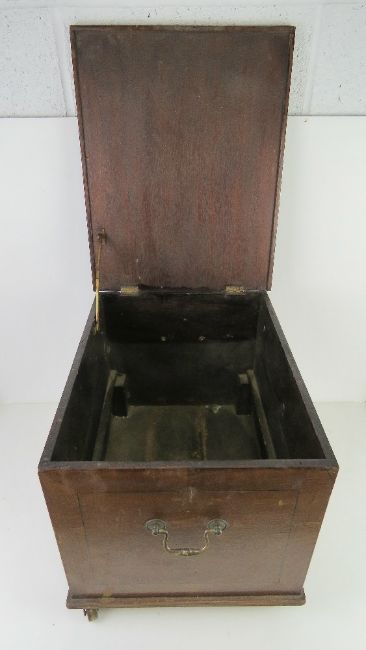 An early 20th century log box raised over brass castors, 48 x 38.5 x 38.5cm.