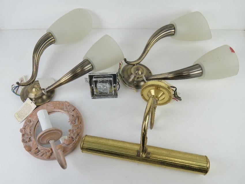 A quantity of wall light fittings including brass downlighting fitting.