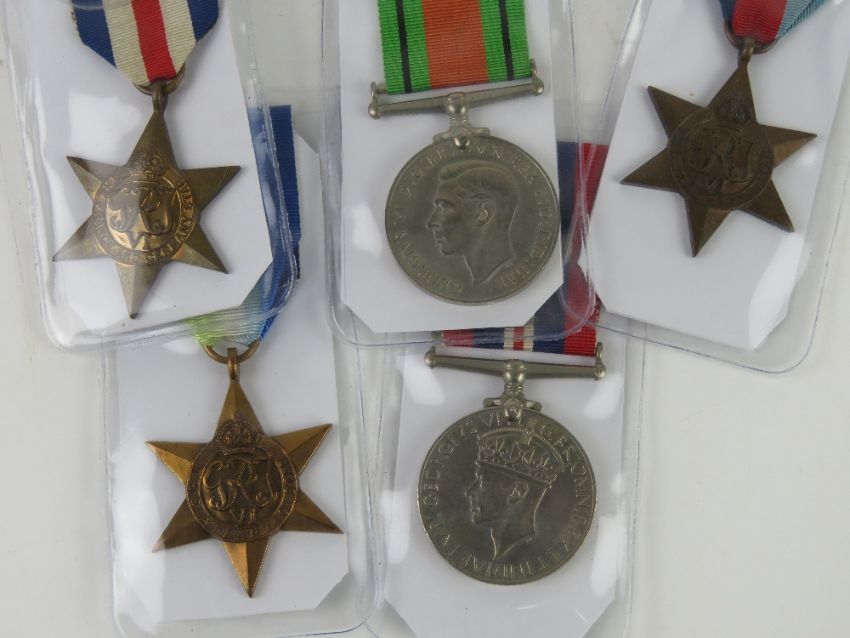 Five WWII Medals which includes defence medal, 1939-1945 medal, 1939-1945 star, Atlantic star and France & Germany star.