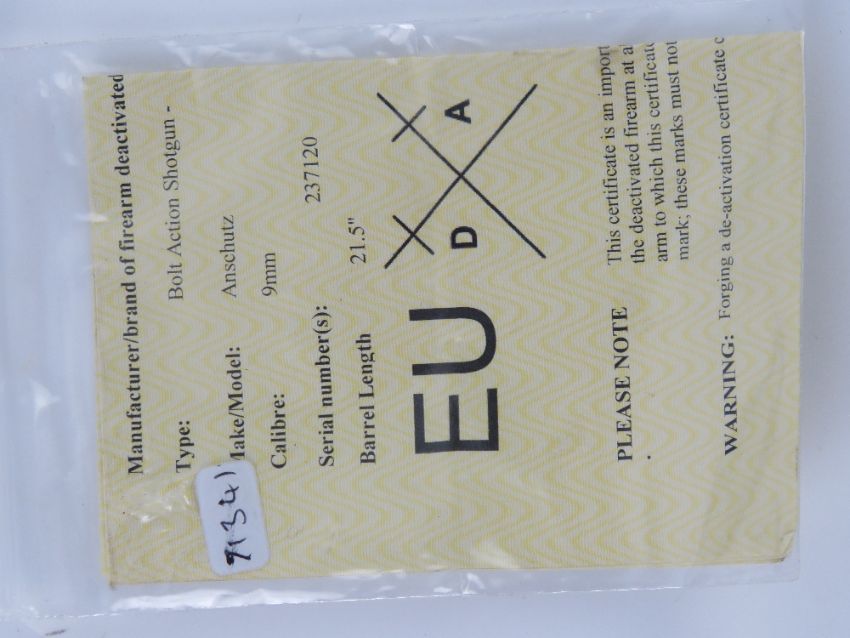 A deactivated Anschutz .22LR Rifle. Latest EU spec moving bolt and trigger. With certificate.